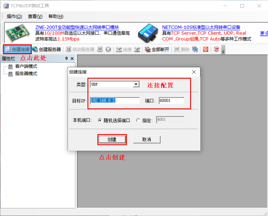 (1)打开测试工具,界面如下,点击创建连接,在弹出的设置窗口中,我们设置类型为TCP,目标服务器ip为192.168.0.2,端口号为60001,点击创建。