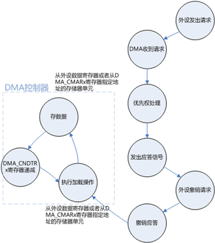 3. DMA_SxNDTR计数器在数据存储结束后递减,该计数器中包含仍需执行的事务数。在产生事件后,外设会向DMA控制器发送请求信号。DMA控制器根据通道优先级处理该请求。只要DMA控制器访问外设,DMA控制器就会向外设发送确认信号。外设获得DMA控制器的确认信号后,便会立即释放其请求。一旦外设使请求失效,DMA控制器就会释放确认信号。如果有更多请求,外设可以启动下一个事务。