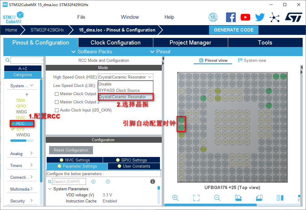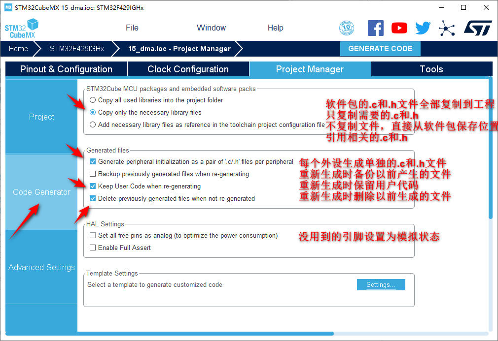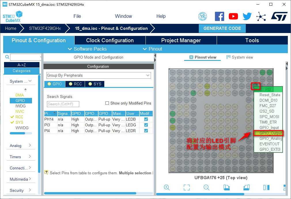 1.在主界面选择File–>New Project或者直接点击ACCEE TO MCU SELECTOR新建项目 2.出现芯片型号选择,搜索自己芯片的型号,双击型号,或者点击Start Project进入配置在搜索栏的下面,提供的各 种查找方式,可以选择芯片内核,型号等等,可以帮助你查找芯片。本实验选取的芯片型号为:STM32F429IGHx 3.使用外部时钟源 4.调试设置选择Serial Wire,时基源选择SysTick 5.分别将LEDG,LEDR,LEDB对应的引脚PI3,PI4,PH14设置为GPIO_Output 6.引脚模式配置 7.DMA配置 8.打开DMA2的中断 9.时钟源设置,选择外部高速时钟源,配置为最大主频 10.工程文件的设置, 这里就是工程的各种配置我们只用到有限几个,其他的默认即IDE我们使用的是 MDK V5.27 11.点击Code Generator,进行进一步配置