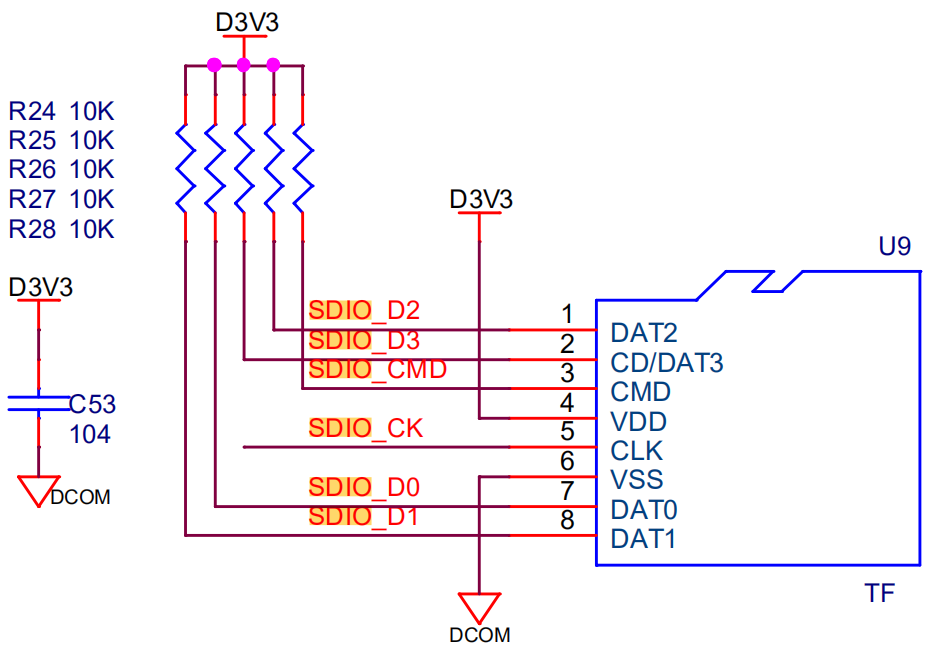 void MX_SDIO_SD_Init(void) //SDIO初始化 { hsd.Instance = SDIO; hsd.Init.ClockEdge = SDIO_CLOCK_EDGE_RISING; hsd.Init.ClockBypass = SDIO_CLOCK_BYPASS_DISABLE; hsd.Init.ClockPowerSave = SDIO_CLOCK_POWER_SAVE_DISABLE; hsd.Init.BusWide = SDIO_BUS_WIDE_1B; hsd.Init.HardwareFlowControl = SDIO_HARDWARE_FLOW_CONTROL_DISABLE; hsd.Init.ClockDiv = 0; if (HAL_SD_Init(&hsd) != HAL_OK) { Error_Handler(); } if (HAL_SD_ConfigWideBusOperation(&hsd, SDIO_BUS_WIDE_4B) != HAL_OK) { Error_Handler(); } }