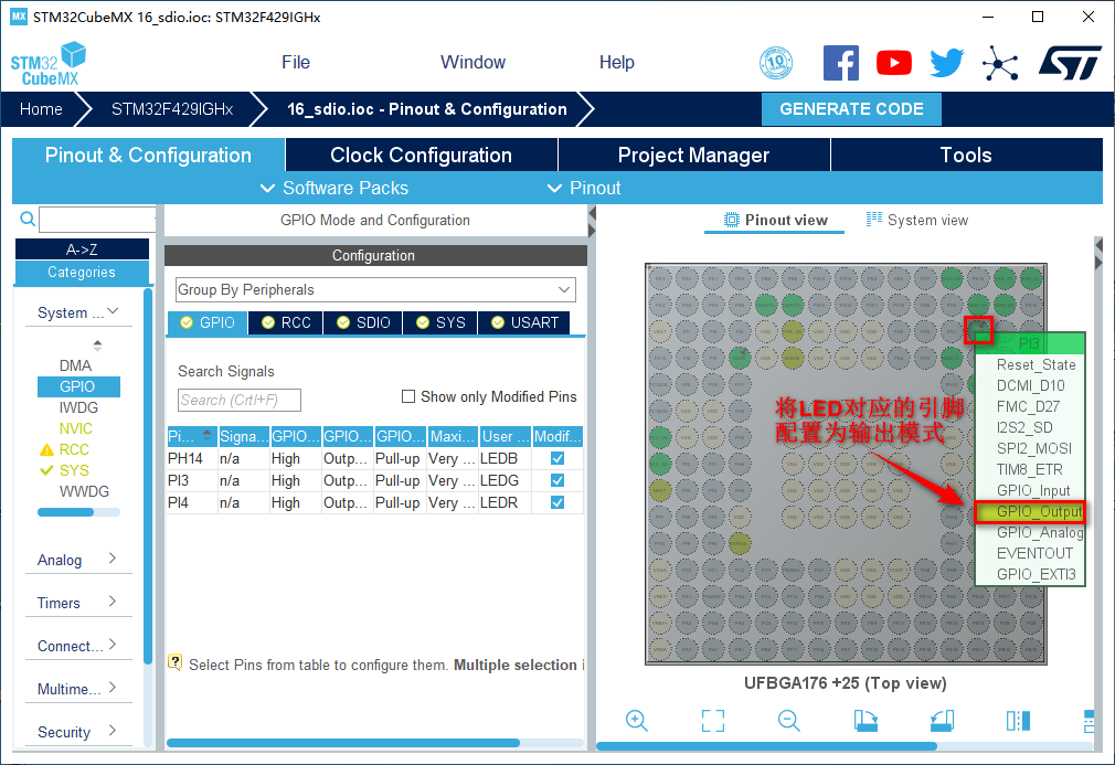 1.在主界面选择File–>New Project或者直接点击ACCEE TO MCU SELECTOR 2.出现芯片型号选择,搜索自己芯片的型号,双击型号,或者点击Start Project进入配置在搜索栏的下面,提供的各种查找方式,可以选择芯片内核,型号,等等,可以帮助你查找芯片。本实验选取的芯片型号为:STM32FIGHx。 3.配置RCC,使用外部时钟源 4.Debug选择Serial Wire,时基源选择SysTick 5.将PI3,PI4,PH14设置为GPIO_Output 6.引脚模式配置 7.设置串口 8.在NVIC Settings一栏使能接收中断 9.配置SDIO 10.时钟源设置,选择外部高速时钟源,配置为最大主频 11.工程文件的设置, 这里就是工程的各种配置 我们只用到有限几个,其他的默认即可IDE我们使用的是MDK V5.27 12.点击Code Generator,进行进一步配置