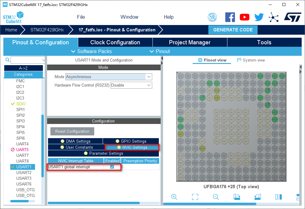 1.在主界面选择File–>New Project或者直接点击ACCEE TO MCU SELECTOR 2.出现芯片型号选择,搜索自己芯片的型号,双击型号,或者点击Start Project进入配置在搜索栏的下面,提供的各 种查找方式,可以选择芯片内核,型号等等,可以帮助你查找芯片。本实验选取的芯片型号为:STM32FIGHx。 3.配置RCC,使用外部时钟源 4.Debug选择Serial Wire,时基源选择SysTick 5.将PI3,PI4,PH14设置为GPIO_Output 6.引脚模式配置 7.设置串口 8.在NVIC Settings一栏使能接收中断 9.配置SDIO 10.配置FATFS 11.时钟源设置,选择外部高速时钟源,配置为最大主频 12.工程文件的设置, 这里就是工程的各种配置 我们只用到有限几个,其他的默认即可IDE我们使用的是MDK V5.27 13.点击Code Generator,进行进一步配置