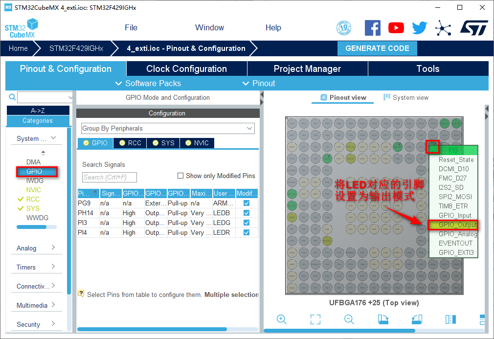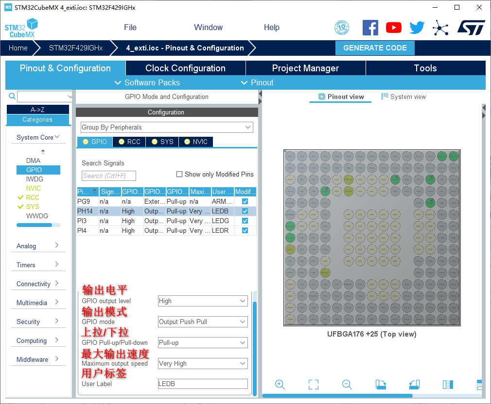 5.将PI3、PI4、PH14设置为GPIO_Output