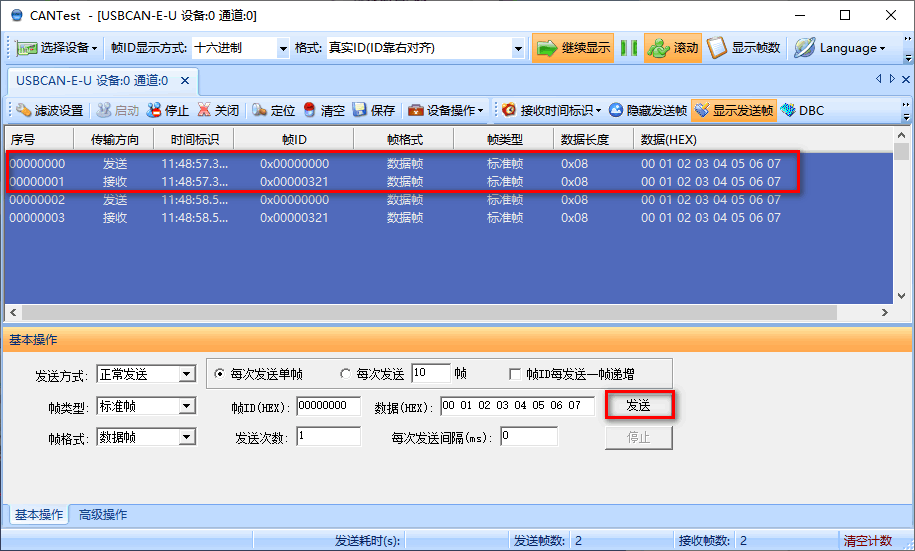 通过CAN助手,点击发送能够接收到数据说明测试通过。