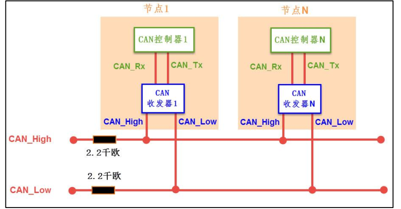 • 我们已经知道CAN控制器和收发器的概念,观察上面2张图,为接线方式,控制器和收发器通过普通的类似TTL逻辑信号来连接,CAN_Low和CAN_High是一对差分信号线。