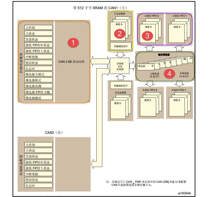 • STM32有两组CAN控制器,其中CAN1为主设备,负责管理bxCAN和512字节的SRAM存储器之间的通信;CAN2为从设备,它不能直接访问SRAM存储器。在使用CAN2的时候必须先使能CAN1外设的时钟。
