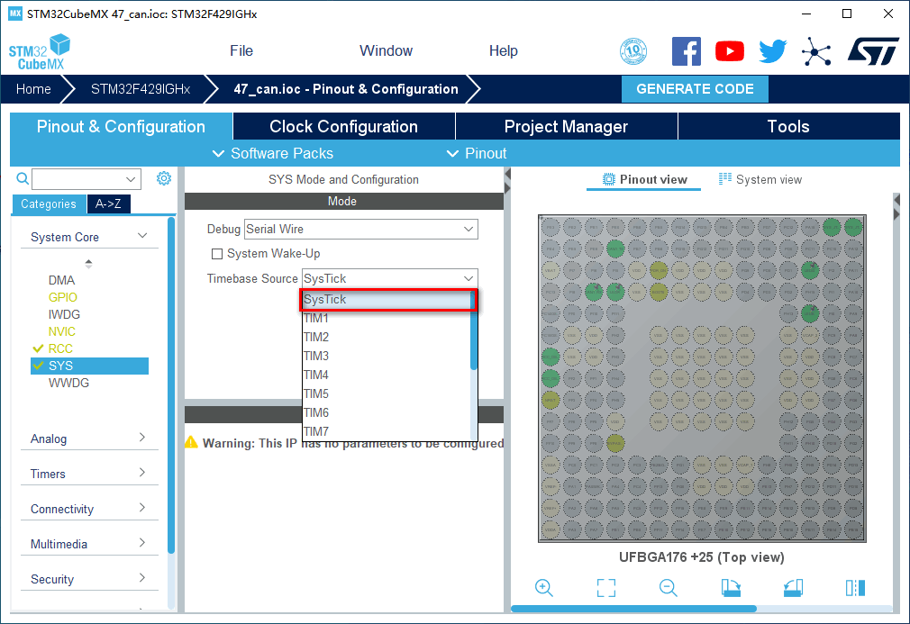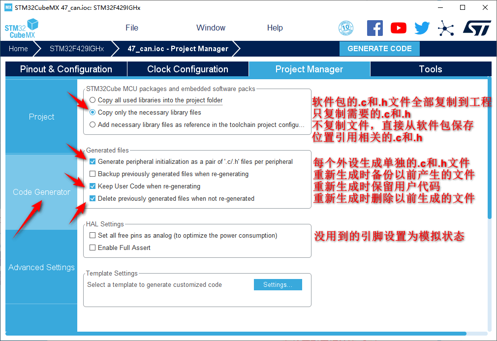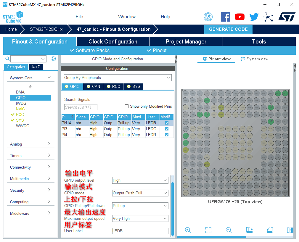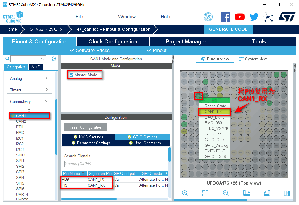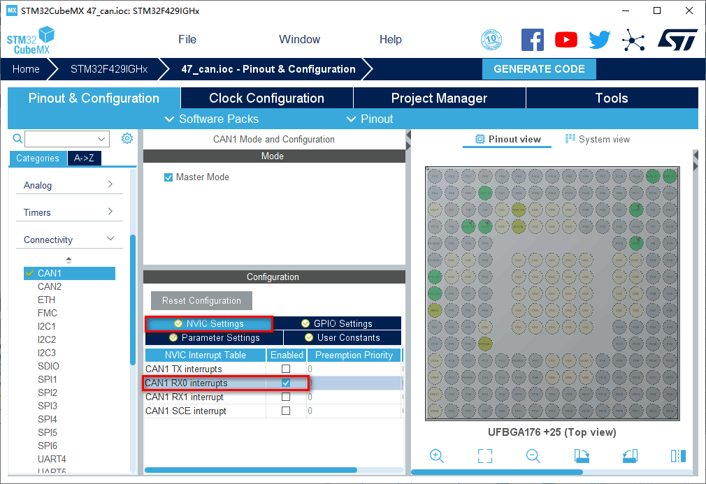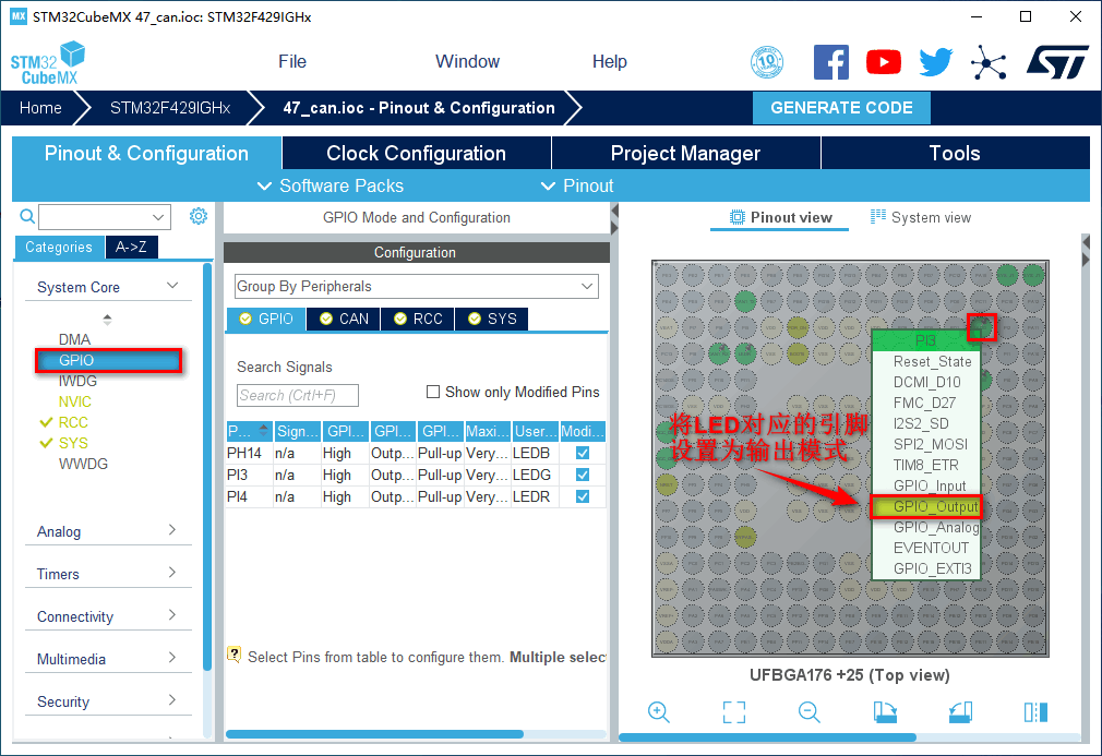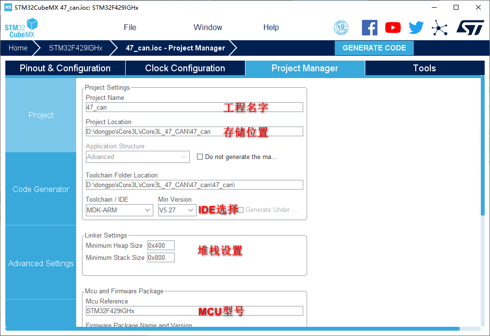 1.在主界面选择File–>New Project或者直接点击ACCEE TO MCU SELECTOR 2.出现芯片型号选择,搜索自己芯片的型号,双击型号,或者点击Start Project进入配置在搜索栏的下面,提供的各 种查找方式,可以选择芯片内核,型号等等,可以帮助你查找芯片。本实验选取的芯片型号为:STM32F429IGHx。 3.配置RCC,使用外部时钟源 4.Debug选择Serial Wire,时基源选择SysTick 5.将PI3,PI4,PH14设置为GPIO_Output 6.引脚模式配置 7.配置CAN 在NVIC Settings一栏使能接收中断 8.时钟源设置,选择外部高速时钟源,配置为最大主频 9.工程文件的设置, 这里就是工程的各种配置 我们只用到有限几个,其他的默认即可IDE我们使用的是MDK V5.27 10.点击Code Generator,进行进一步配置