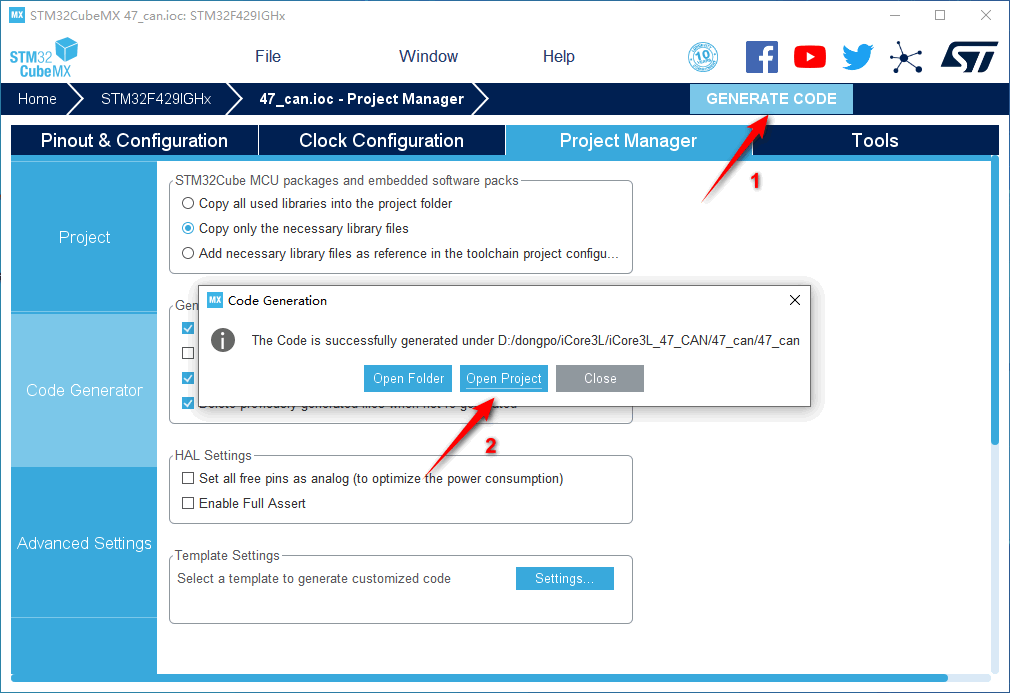 11.然后点击GENERATE CODE创建工程 创建成功,打开工程。