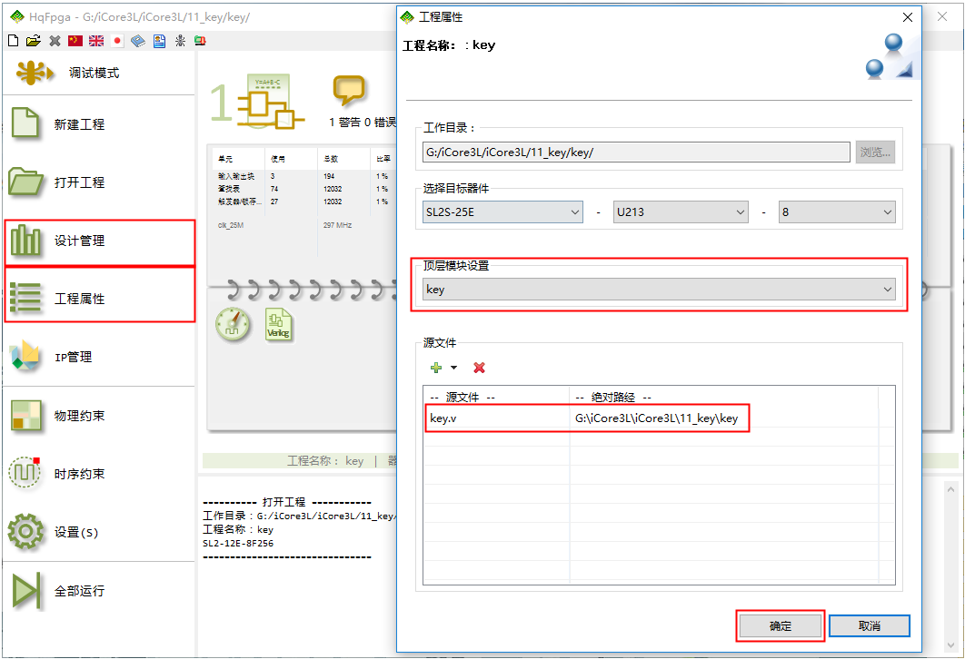 • 2、点击左侧栏“设计管理”按钮,新建源文件,或者通过点击左侧边栏的“工程属性”按钮,将例程下的源文件添加到工程中,并将key模块设置成顶层模块。