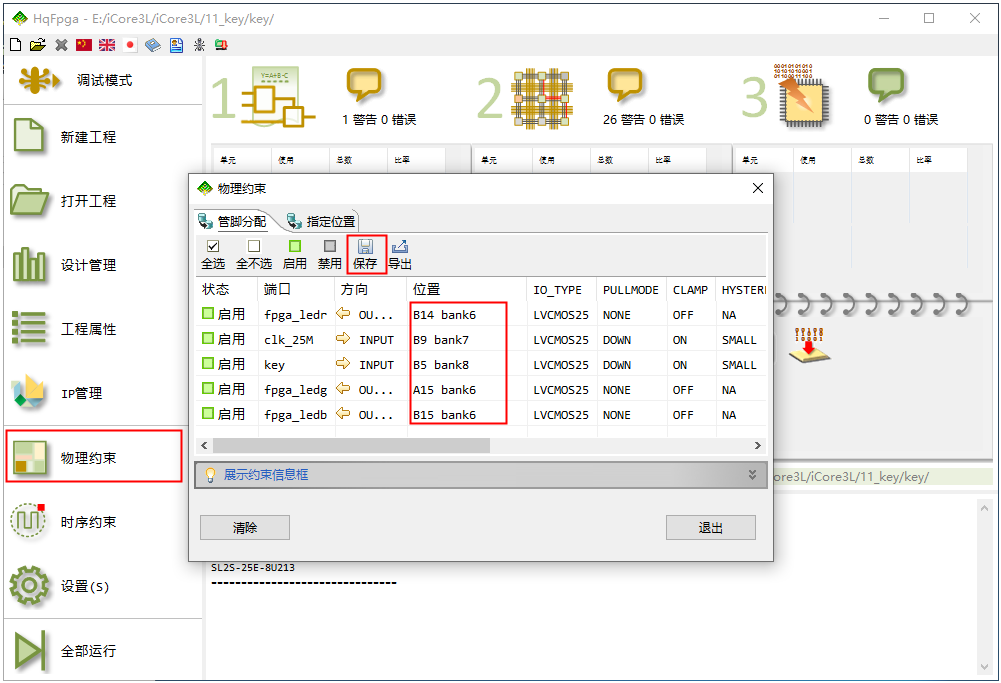 • 3、然后点击“RTL综合”按钮,进行初步编译;无报错后点击左侧栏里的“物理约束”按钮,将按键绑定到相应的引脚;然后点击保存并退出。