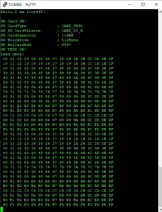 int main(void) { int i,j; unsigned char write_buffer[512]; unsigned char read_buffer[512]; int error = 0; HAL_Init(); SystemClock_Config(); i2c.initialize(); axp152.initialize(); axp152.set_dcdc1(3500);//[ARM & FPGA BK1/2/6 &OTHER] axp152.set_dcdc2(1200);//[FPGA INT & PLL D] axp152.set_aldo1(2500);//[FPGA PLL A] axp152.set_dcdc4(3300);//[POWER_OUTPUT] axp152.set_dcdc3(3300);//[FPGA BK4][Adjustable] axp152.set_aldo2(3300);//[FPGA BK3][Adjustable] axp152.set_dldo1(3300);//[FPGA BK7][Adjustable] axp152.set_dldo2(3300);//[FPGA BK5][Adjustable] MX_GPIO_Init(); MX_USART2_UART_Init(); MX_SDMMC1_SD_Init(); usart2.initialize(115200); //串口波特率设置 usart2.printf("\x0c"); //清屏 usart2.printf("\033[1;32;40m"); //设置终端字体为绿色 usart2.printf("Hello,I am iCore4T!\r\n\r\n"); // 配置 SD 接口位宽为 4bit 用于数据传输 if(HAL_SD_ConfigWideBusOperation(&hsd1, SDMMC_BUS_WIDE_4B) != HAL_OK){ usart2.printf("SD Card Error!\r\n"); while(1){ LED_ON; HAL_Delay(500); LED_OFF; HAL_Delay(500); } }else{ usart2.printf("SD Card OK!\r\n"); } //打印SD卡类型 switch(hsd1.SdCard.CardType){ case CARD_SDSC: usart2.printf("SD CardType\t\t: CARD_SDSC\r\n"); break; case CARD_SDHC_SDXC: usart2.printf("SD CardType\t\t: CARD_SDHC_SDXC\r\n"); break; case CARD_SECURED: usart2.printf("SD CardType\t\t: CARD_SECURED\r\n"); break; } switch(hsd1.SdCard.CardVersion){ //打印SD卡规范版本 case CARD_V1_X: usart2.printf("SD CardVersion\t: CARD_V1_X\r\n"); break; case CARD_V2_X: usart2.printf("SD SD CardVersion\t: CARD_V2_X\r\n"); break; } usart2.printf("SD CardCapacity\t\t: %dMB\r\n",(unsigned int)(hsd1.SdCard.BlockNbr * hsd1.SdCard.BlockSize) >> 20); //打印SD卡容量 usart2.printf("SD BlockSize\t\t: %dByte\r\n",hsd1.SdCard.BlockSize); //打印SD卡数据块大小 usart2.printf("SD RelCardAdd\t\t: %d\r\n",hsd1.SdCard.RelCardAdd); //打印SD卡相对地址 //从缓冲区写入512字节数据到SD卡数据块 for(i = 0;i < 512;i++){ write_buffer[i] = i % 256; } HAL_SD_WriteBlocks(&hsd1,write_buffer,0,1,1000); //读取SD卡数据块数据到缓冲区 HAL_SD_ReadBlocks(&hsd1,read_buffer,0,1,1000); for(i = 0;i < 512;i ++){ if(write_buffer[i] != read_buffer[i]){ //比较数据是否读写正确 error ++; } } if(error){ //测试失败,LED闪烁 usart2.printf("SD TEST FAIL!\r\n"); while(1){ LED_ON; HAL_Delay(500); LED_OFF; HAL_Delay(500); } }else{ //测试成功打印读取到的数据 LED_ON; usart2.printf("SD TEST OK!\r\n"); usart2.printf("read data:\r\n"); for(i = 0;i < 32;i++){ for(j = 0; j < 16; j ++) usart2.printf(" %02X",read_buffer[i*16+j]); usart2.printf("\r\n"); } } while (1) { } }