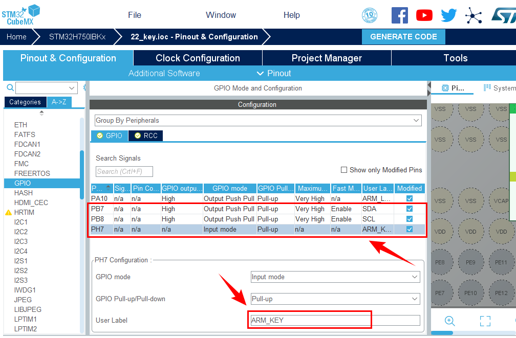 1.在主界面选择File–>New Project 或者直接点击ACCEE TO MCU SELECTOR 2.出现芯片型号选择,搜索自己芯片的型号,双击型号,或者点击Start Project进入配置 在搜索栏的下面,提供的各 种查找方式,可以选择芯片内核,型号,等等,可以帮助你查找芯片。本实验选取的芯片型号为:STM32H750IBKx。 3.配置RCC,使用外部时钟源 4.时基源选择SysTick 5.将PA10,PB7,PB8设置为GPIO_Output 6.将ARM_KEY对应的引脚PH7设置为GPIO_Intput 7.引脚模式配置 8.配置IWDG 9.时钟源设置,选择外部高速时钟源,配置为最大主频 10.工程文件的设置, 这里就是工程的各种配置 我们只用到有限几个,其他的默认即可 IDE我们使用的是 MDK V5.27 11.点击Code Generator,进行进一步配置