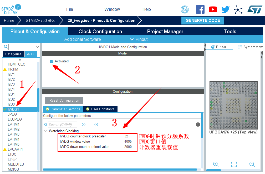 void MX_IWDG1_Init(void) { hiwdg1.Instance = IWDG1; hiwdg1.Init.Prescaler = IWDG_PRESCALER_32; //预分频系数 hiwdg1.Init.Window = 4095; //窗口值 hiwdg1.Init.Reload = 2000; //重装载值 if (HAL_IWDG_Init(&hiwdg1) != HAL_OK) { Error_Handler(); } }