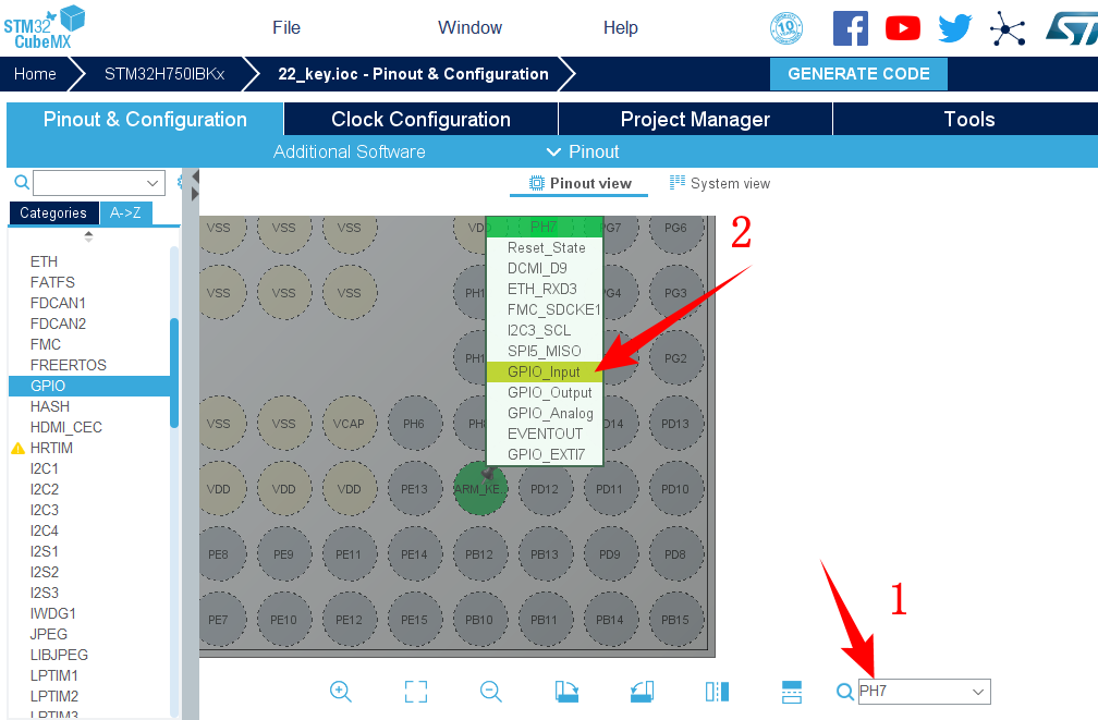 1.在主界面选择File–>New Project 或者直接点击ACCEE TO MCU SELECTOR 2.出现芯片型号选择,搜索自己芯片的型号,双击型号,或者点击Start Project进入配置 在搜索栏的下面,提供的各 种查找方式,可以选择芯片内核,型号,等等,可以帮助你查找芯片。本实验选取的芯片型号为:STM32H750IBKx。 3.配置RCC,使用外部时钟源 4.时基源选择SysTick 5.将PA10,PB7,PB8设置为GPIO_Output 6.将ARM_KEY对应的引脚PH7设置为GPIO_Intput 7.引脚模式配置 8.配置USB_OTG_HS 9.配置USB_DEVICE 10.时钟源设置,选择外部高速时钟源,配置为最大主频 11.工程文件的设置, 这里就是工程的各种配置 我们只用到有限几个,其他的默认即可 IDE我们使用的是 MDK V5.27 12.点击Code Generator,进行进一步配置