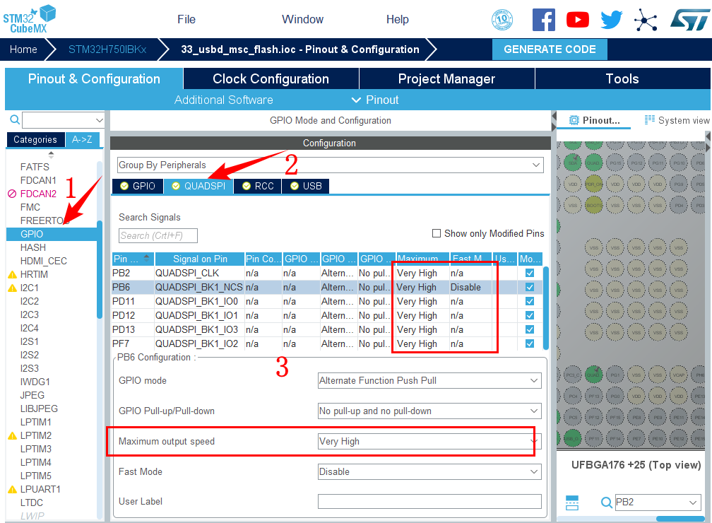 void HAL_QSPI_MspInit(QSPI_HandleTypeDef* qspiHandle) { GPIO_InitTypeDef GPIO_InitStruct = {0}; if(qspiHandle->Instance==QUADSPI) { /* QUADSPI时钟使能 */ __HAL_RCC_QSPI_CLK_ENABLE(); __HAL_RCC_GPIOB_CLK_ENABLE(); __HAL_RCC_GPIOF_CLK_ENABLE(); __HAL_RCC_GPIOD_CLK_ENABLE(); /** QUADSPI GPIO配置 PB6 ------> QUADSPI_BK1_NCS PF7 ------> QUADSPI_BK1_IO2 PB2 ------> QUADSPI_CLK PD13 ------> QUADSPI_BK1_IO3 PD12 ------> QUADSPI_BK1_IO1 PD11 ------> QUADSPI_BK1_IO0 */ GPIO_InitStruct.Pin = GPIO_PIN_6; GPIO_InitStruct.Mode = GPIO_MODE_AF_PP; GPIO_InitStruct.Pull = GPIO_NOPULL; GPIO_InitStruct.Speed = GPIO_SPEED_FREQ_VERY_HIGH; GPIO_InitStruct.Alternate = GPIO_AF10_QUADSPI; HAL_GPIO_Init(GPIOB, &GPIO_InitStruct); GPIO_InitStruct.Pin = GPIO_PIN_7; GPIO_InitStruct.Mode = GPIO_MODE_AF_PP; GPIO_InitStruct.Pull = GPIO_NOPULL; GPIO_InitStruct.Speed = GPIO_SPEED_FREQ_VERY_HIGH; GPIO_InitStruct.Alternate = GPIO_AF9_QUADSPI; HAL_GPIO_Init(GPIOF, &GPIO_InitStruct); GPIO_InitStruct.Pin = GPIO_PIN_2; GPIO_InitStruct.Mode = GPIO_MODE_AF_PP; GPIO_InitStruct.Pull = GPIO_NOPULL; GPIO_InitStruct.Speed = GPIO_SPEED_FREQ_VERY_HIGH; GPIO_InitStruct.Alternate = GPIO_AF9_QUADSPI; HAL_GPIO_Init(GPIOB, &GPIO_InitStruct); GPIO_InitStruct.Pin = GPIO_PIN_13|GPIO_PIN_12|GPIO_PIN_11; GPIO_InitStruct.Mode = GPIO_MODE_AF_PP; GPIO_InitStruct.Pull = GPIO_NOPULL; GPIO_InitStruct.Speed = GPIO_SPEED_FREQ_VERY_HIGH; GPIO_InitStruct.Alternate = GPIO_AF9_QUADSPI; HAL_GPIO_Init(GPIOD, &GPIO_InitStruct); } }
