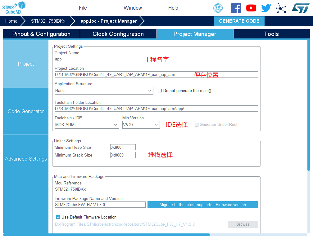 10.然后点击GENERATE CODE 创建工程 创建成功,打开工程。