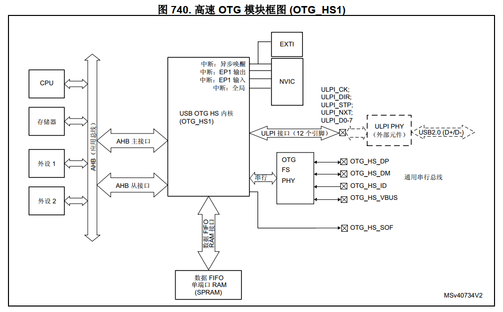 • STM32H7中存在两个OTG_HS模块(OTG_HS1和OTG_HS2)。尽管他们都可以编程为HS操作,但只有OTG_HS1具有可访问的ULPI接口,因此允许使用外部HS收发器进行高速操作。