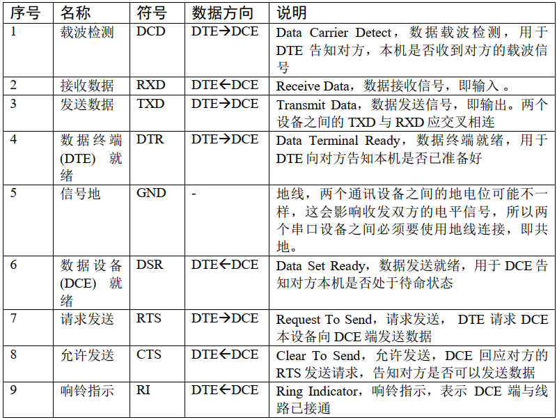 • DB9 信号线说明(公头,为方便理解,可把 DTE 理解为计算机, DCE 理解为调制解调器)如下图: