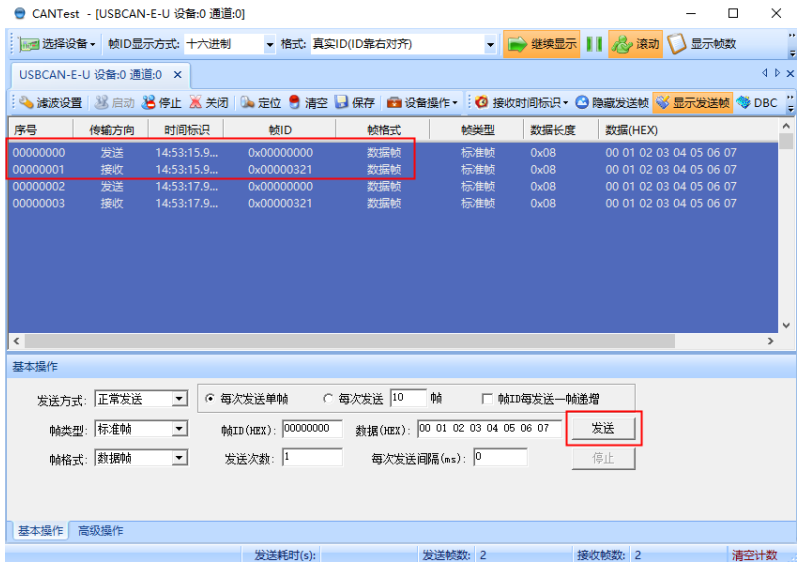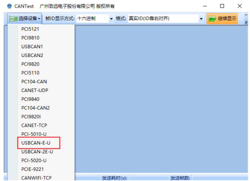 CAN 接口需要安装自带的 CANtest 测试工具,安装完毕后,打开并选择设备 USBCANE-U,波特率设置为 1000K,并启动。