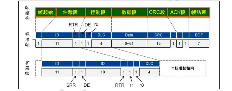 SOF段(Start Of Frame),翻译为帧起始,标准帧和扩展帧都是通过一个显性电平表示帧起始。它用于通知各个节点将有数据传输,其它节点通过帧起始信号的电平跳变沿来进行硬同步。