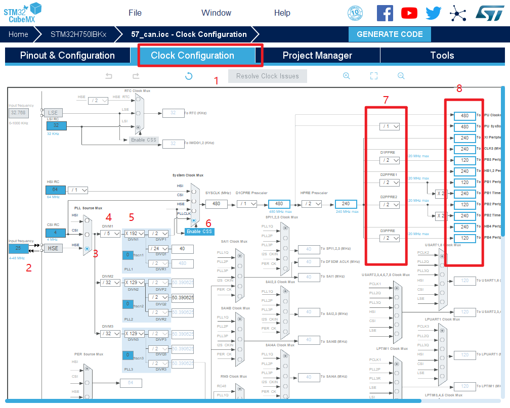 8.时钟源设置,选择外部高速时钟源,配置为最大主频
