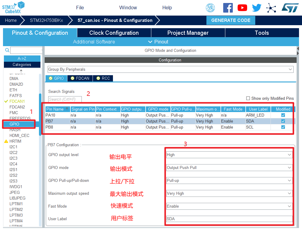 5.将PA10,PB7,PB8设置为GPIO_Output