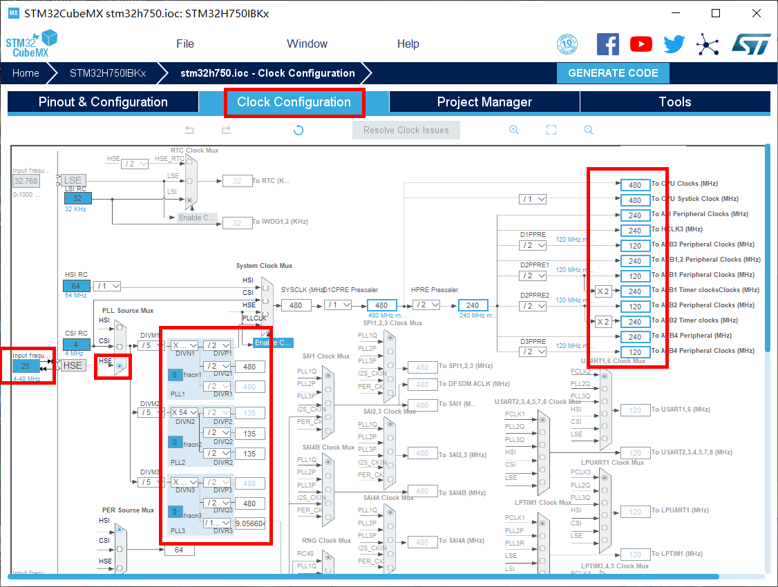 13.时钟源设置,选择外部高速时钟源,配置为最大主频。