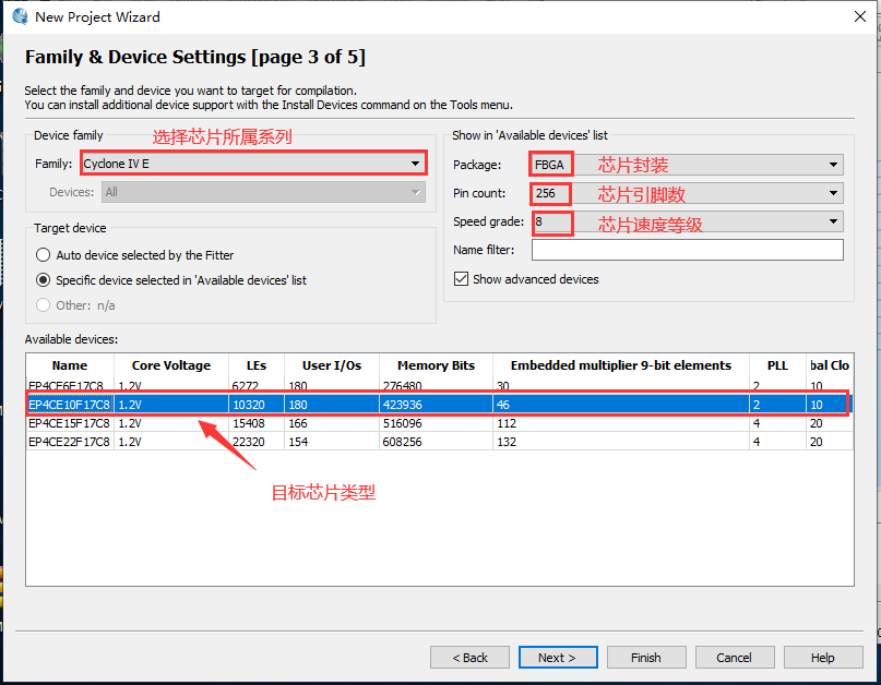 6、选择设备所用的芯片型号,芯片的系列、封装、引脚数、速度等级的选项方便用户更快速精确的找到目标芯片的型号,如图2.7所示。