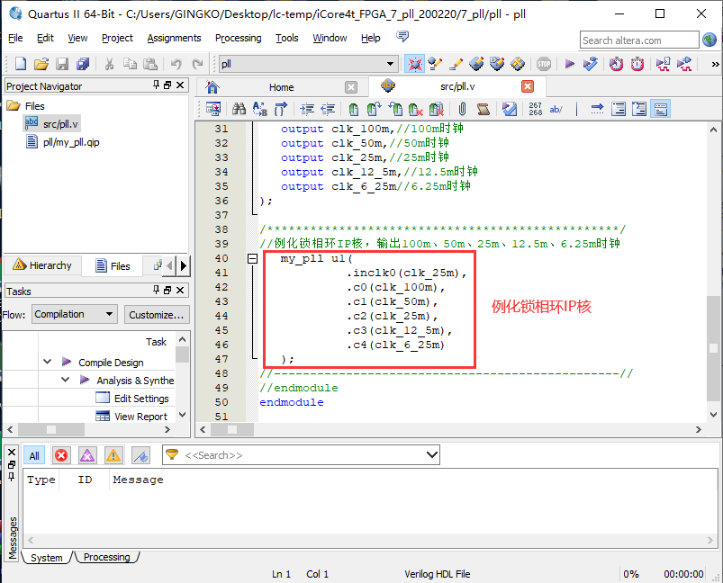 18、程序编写完成后进行编译即可,此时锁相环调用完成。