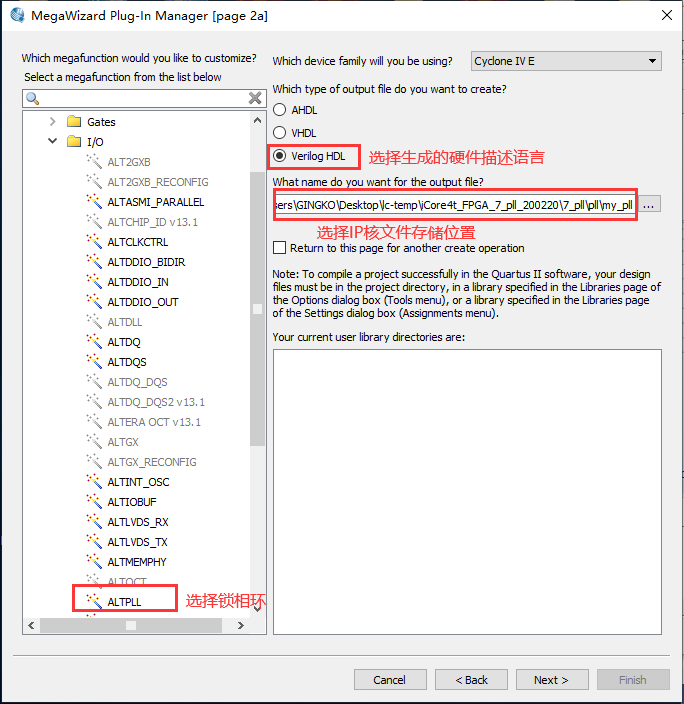 3、在此对话框选择新建IP核类型、生成的硬件描述语言、IP核文件的存储位置,如图7.3所示。
