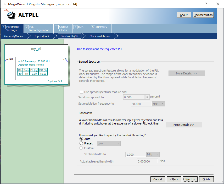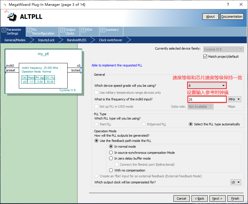 4、在此对话框中设置速度等级和输入时钟大小,设备芯片的速度等级是8,输入参考时钟是25MHz,如图7.4所示。 图7.4