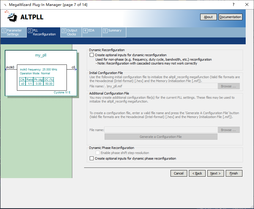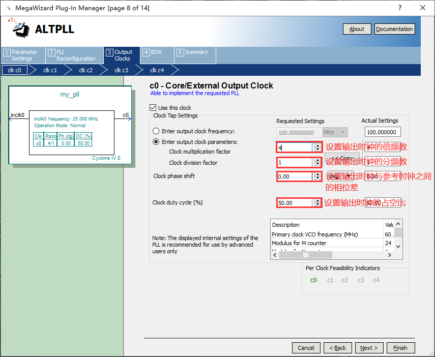 9、设置第一个输出时钟100MHz,由25MHz输入时钟进行4倍频得到的,输出时钟相位差为0,占空比为50%,设置参数如图7.9所示。 图7.9