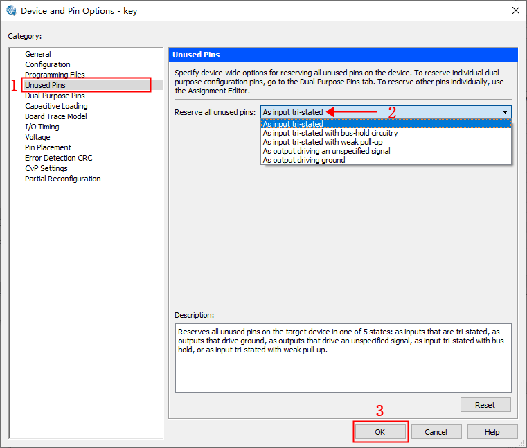 1、点击Assignments,下拉菜单中点击Device…。 2、弹出窗口中点击Device and Pin Options… 。 3、点击左侧边栏中的Unused Pins,右侧下拉菜单中选择As input tri-stated,然后点击OK即可。 4、回到工程主界面后点击保存按钮,然后点击编译,至此完成引脚设置。