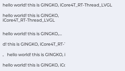 lvgl2rtt_init("lcd"); lv_obj_t * label1 = lv_label_create(lv_scr_act(), NULL); /*创建一个标签在屏幕中*/ lv_label_set_text(label1, "hello world\nthis is GINGKO\niCore4T_RT-Thread_LVGL");