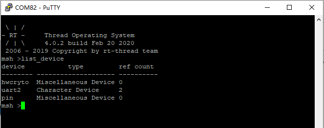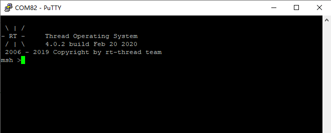 • iCore4T双核心板自带DEBUG_UART,打开终端Putty,程序运行后我们会发现RT-Thread信息打印在了终端。