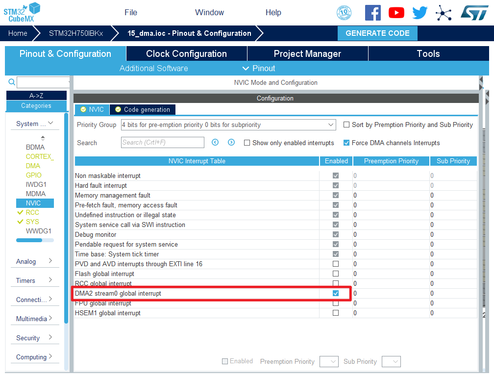void MX_DMA_Init(void) { //使能DMA控制器时钟 __HAL_RCC_DMA2_CLK_ENABLE(); //配置DMA工作方式 hdma_memtomem_dma2_stream0.Instance = DMA2_Stream0; hdma_memtomem_dma2_stream0.Init.Request = DMA_REQUEST_MEM2MEM; hdma_memtomem_dma2_stream0.Init.Direction = DMA_MEMORY_TO_MEMORY;//方向为存储器到存储器 hdma_memtomem_dma2_stream0.Init.PeriphInc = DMA_PINC_ENABLE; hdma_memtomem_dma2_stream0.Init.MemInc = DMA_MINC_ENABLE; hdma_memtomem_dma2_stream0.Init.PeriphDataAlignment = DMA_PDATAALIGN_WORD;//外设数据宽度 hdma_memtomem_dma2_stream0.Init.MemDataAlignment = DMA_MDATAALIGN_WORD;//存储器数据宽度 hdma_memtomem_dma2_stream0.Init.Mode = DMA_NORMAL; hdma_memtomem_dma2_stream0.Init.Priority = DMA_PRIORITY_HIGH;//优先级别为高 hdma_memtomem_dma2_stream0.Init.FIFOMode = DMA_FIFOMODE_ENABLE; hdma_memtomem_dma2_stream0.Init.FIFOThreshold = DMA_FIFO_THRESHOLD_FULL; hdma_memtomem_dma2_stream0.Init.MemBurst = DMA_MBURST_SINGLE;//存储器突发单次传输 hdma_memtomem_dma2_stream0.Init.PeriphBurst = DMA_PBURST_SINGLE;//外设突发单次传输 if (HAL_DMA_Init(&hdma_memtomem_dma2_stream0) != HAL_OK) { Error_Handler(); } //DMA2中断配置 HAL_NVIC_SetPriority(DMA2_Stream0_IRQn, 0, 0); HAL_NVIC_EnableIRQ(DMA2_Stream0_IRQn); }