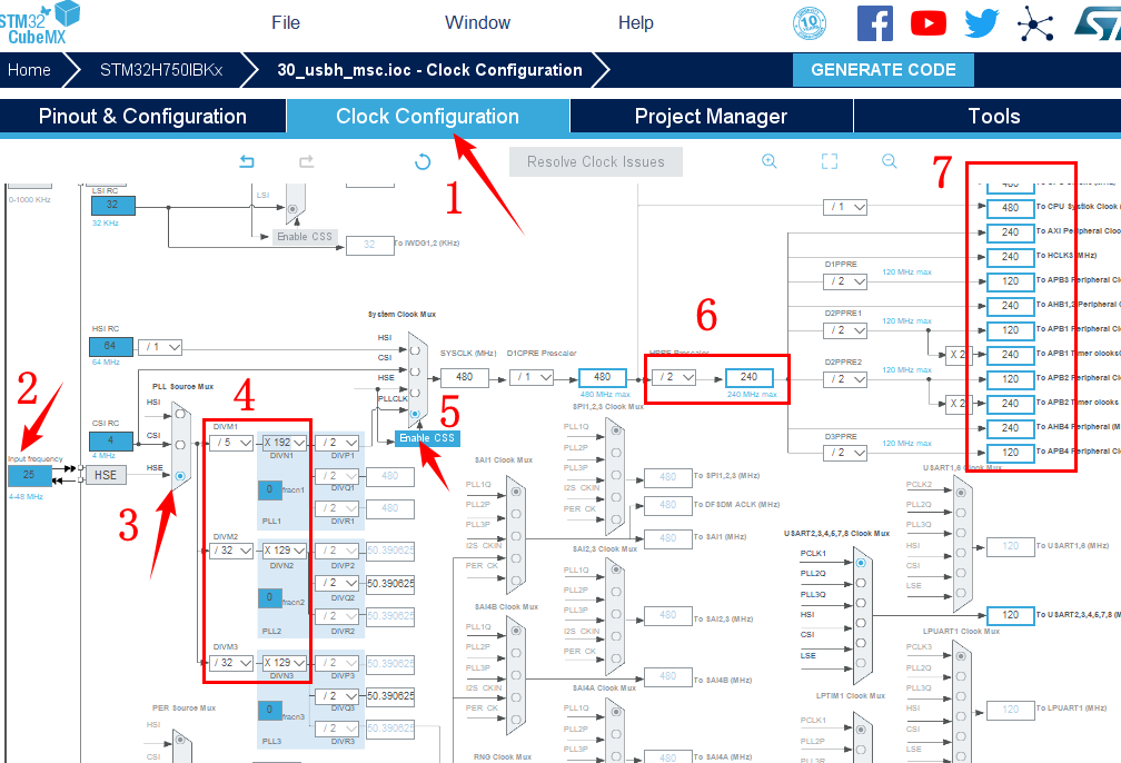 11.时钟源设置,选择外部高速时钟源,配置为最大主频。