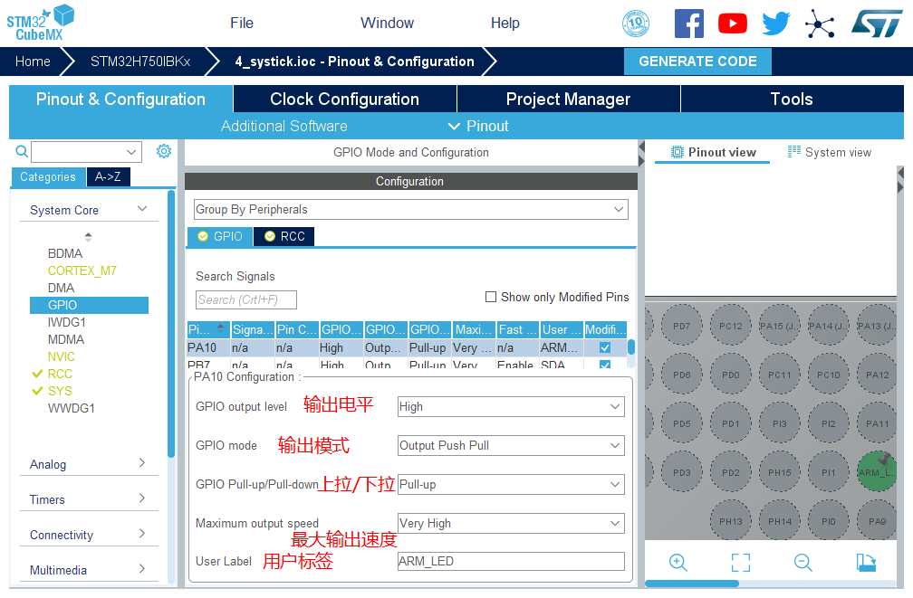 5.将PA10,PB7,PB8设置为GPIO_Output。