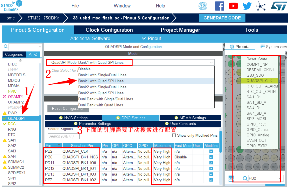 void HAL_QSPI_MspInit(QSPI_HandleTypeDef* qspiHandle) { GPIO_InitTypeDef GPIO_InitStruct = {0}; if(qspiHandle->Instance==QUADSPI) { /* QUADSPI时钟使能 */ __HAL_RCC_QSPI_CLK_ENABLE(); __HAL_RCC_GPIOB_CLK_ENABLE(); __HAL_RCC_GPIOF_CLK_ENABLE(); __HAL_RCC_GPIOD_CLK_ENABLE(); /** QUADSPI GPIO配置 PB6 ------> QUADSPI_BK1_NCS PF7 ------> QUADSPI_BK1_IO2 PB2 ------> QUADSPI_CLK PD13 ------> QUADSPI_BK1_IO3 PD12 ------> QUADSPI_BK1_IO1 PD11 ------> QUADSPI_BK1_IO0 */ GPIO_InitStruct.Pin = GPIO_PIN_6; GPIO_InitStruct.Mode = GPIO_MODE_AF_PP; GPIO_InitStruct.Pull = GPIO_NOPULL; GPIO_InitStruct.Speed = GPIO_SPEED_FREQ_VERY_HIGH; GPIO_InitStruct.Alternate = GPIO_AF10_QUADSPI; HAL_GPIO_Init(GPIOB, &GPIO_InitStruct); GPIO_InitStruct.Pin = GPIO_PIN_7; GPIO_InitStruct.Mode = GPIO_MODE_AF_PP; GPIO_InitStruct.Pull = GPIO_NOPULL; GPIO_InitStruct.Speed = GPIO_SPEED_FREQ_VERY_HIGH; GPIO_InitStruct.Alternate = GPIO_AF9_QUADSPI; HAL_GPIO_Init(GPIOF, &GPIO_InitStruct); GPIO_InitStruct.Pin = GPIO_PIN_2; GPIO_InitStruct.Mode = GPIO_MODE_AF_PP; GPIO_InitStruct.Pull = GPIO_NOPULL; GPIO_InitStruct.Speed = GPIO_SPEED_FREQ_VERY_HIGH; GPIO_InitStruct.Alternate = GPIO_AF9_QUADSPI; HAL_GPIO_Init(GPIOB, &GPIO_InitStruct); GPIO_InitStruct.Pin = GPIO_PIN_13|GPIO_PIN_12|GPIO_PIN_11; GPIO_InitStruct.Mode = GPIO_MODE_AF_PP; GPIO_InitStruct.Pull = GPIO_NOPULL; GPIO_InitStruct.Speed = GPIO_SPEED_FREQ_VERY_HIGH; GPIO_InitStruct.Alternate = GPIO_AF9_QUADSPI; HAL_GPIO_Init(GPIOD, &GPIO_InitStruct); } }