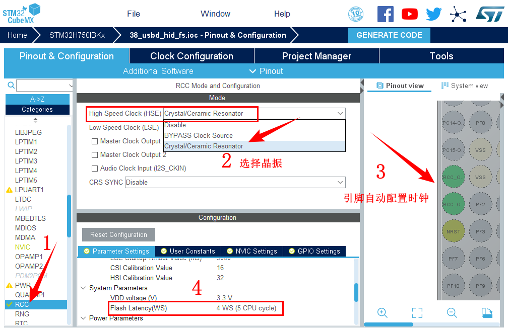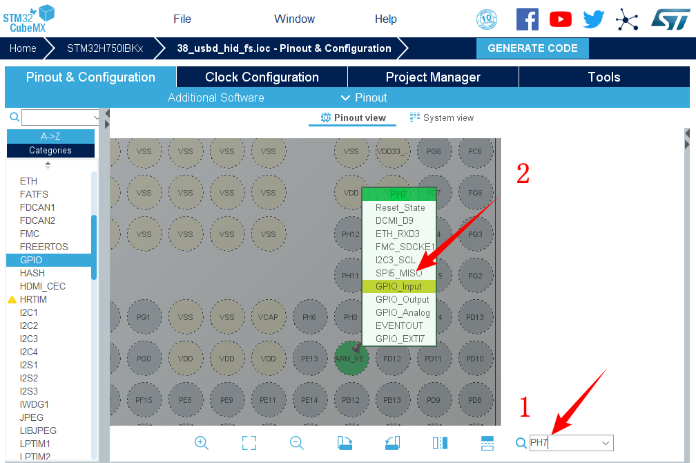 1.在主界面选择File–>New Project 或者直接点击ACCEE TO MCU SELECTOR 2.出现芯片型号选择,搜索自己芯片的型号,双击型号,或者点击Start Project进入配置 在搜索栏的下面,提供的各 种查找方式,可以选择芯片内核,型号,等等,可以帮助你查找芯片。本实验选取的芯片型号为:STM32H750IBKx。 3.配置RCC,使用外部时钟源 4.时基源选择SysTick 5.将PA10,PB7,PB8设置为GPIO_Output 6.将ARM_KEY对应的引脚PH7设置为GPIO_Intput 7.引脚模式配置 8.配置USB_OTG_FS 9.配置USB_DEVICE 10.时钟源设置,选择外部高速时钟源,配置为最大主频 11.工程文件的设置, 这里就是工程的各种配置 我们只用到有限几个,其他的默认即可 IDE我们使用的是 MDK V5.27 12.点击Code Generator,进行进一步配置