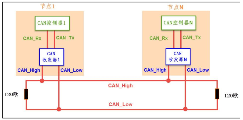 • 我们已经知道CAN控制器和收发器的概念,观察上面2张图,为接线方式,控制器和收发器通过普通的类似TTL逻辑信号来连接,CAN_Low和CAN_High是一对差分信号线。