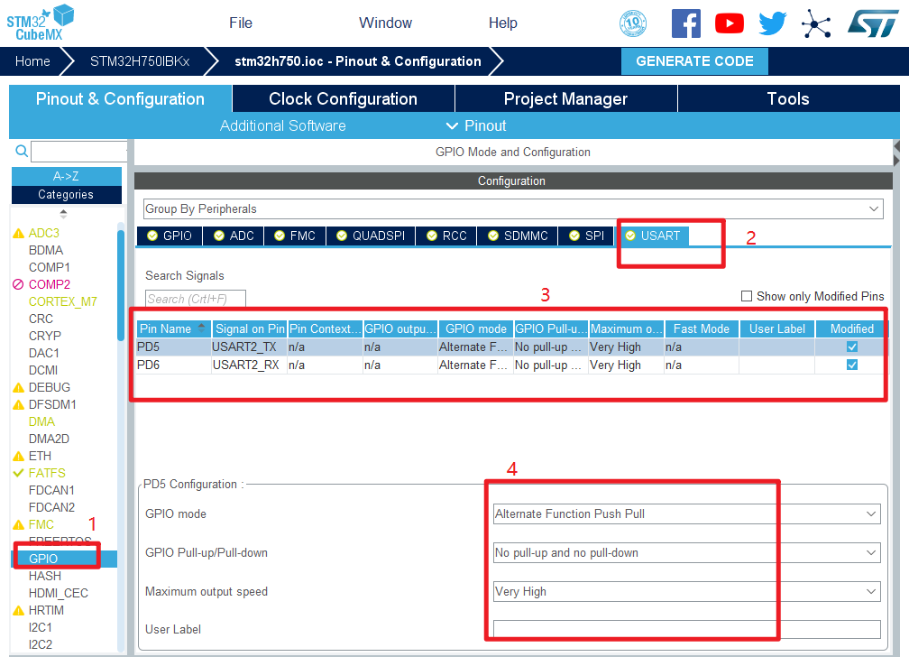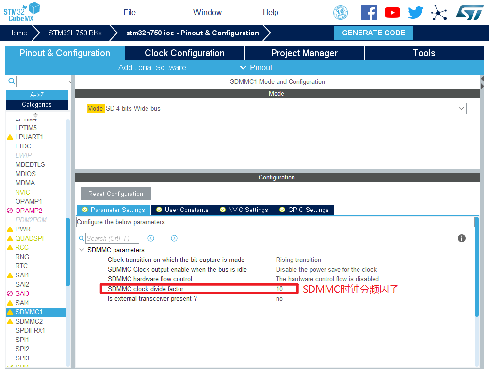 1.在主界面选择File–>New Project 或者直接点击ACCEE TO MCU SELECTOR 2.出现芯片型号选择,搜索自己芯片的型号,双击型号,或者点击Start Project进入配置 在搜索栏的下面,提供的各 种查找方式,可以选择芯片内核,型号,等等,可以帮助你查找芯片。本实验选取的芯片型号为:STM32H750IBKx。 3.配置RCC,使用外部时钟源 4.时基源选择SysTick 5.将PA10,PB7,PB8设置为GPIO_Output 6.引脚模式配置 7.配置串口 在NVIC Settings一栏使能接收中断 引脚配置 8.配置ADC 9.配置QUADSPI 10.配置SDMMC 11.配置FATFS 12.配置SPI 13.配置FMC 14.时钟源设置,选择外部高速时钟源,配置为最大主频 15.工程文件的设置, 这里就是工程的各种配置 我们只用到有限几个,其他的默认即可 IDE我们使用的是 MDK V5.27 16.点击Code Generator,进行进一步配置
