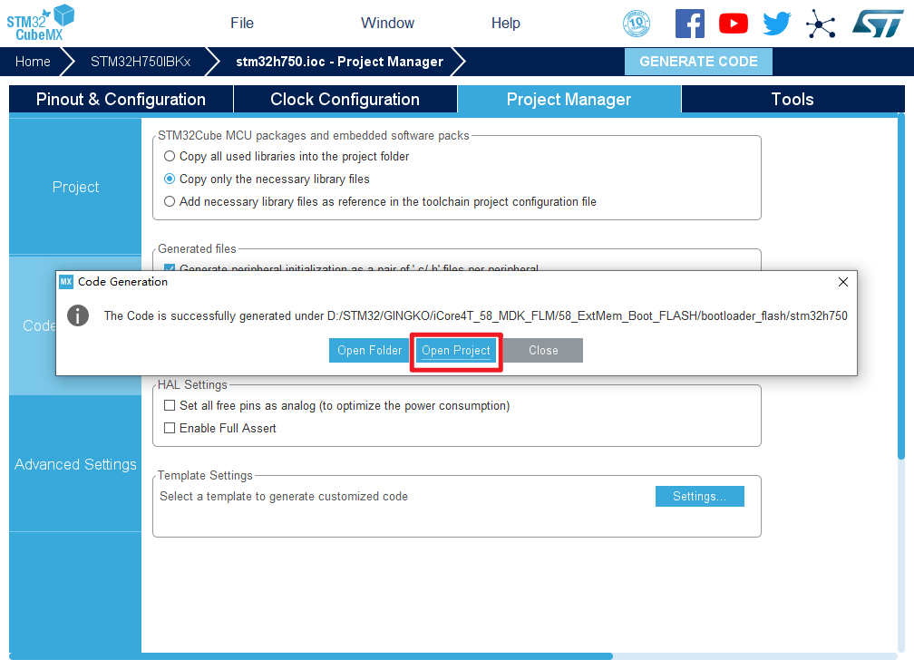 17.然后点击GENERATE CODE 创建工程 创建成功,打开工程。