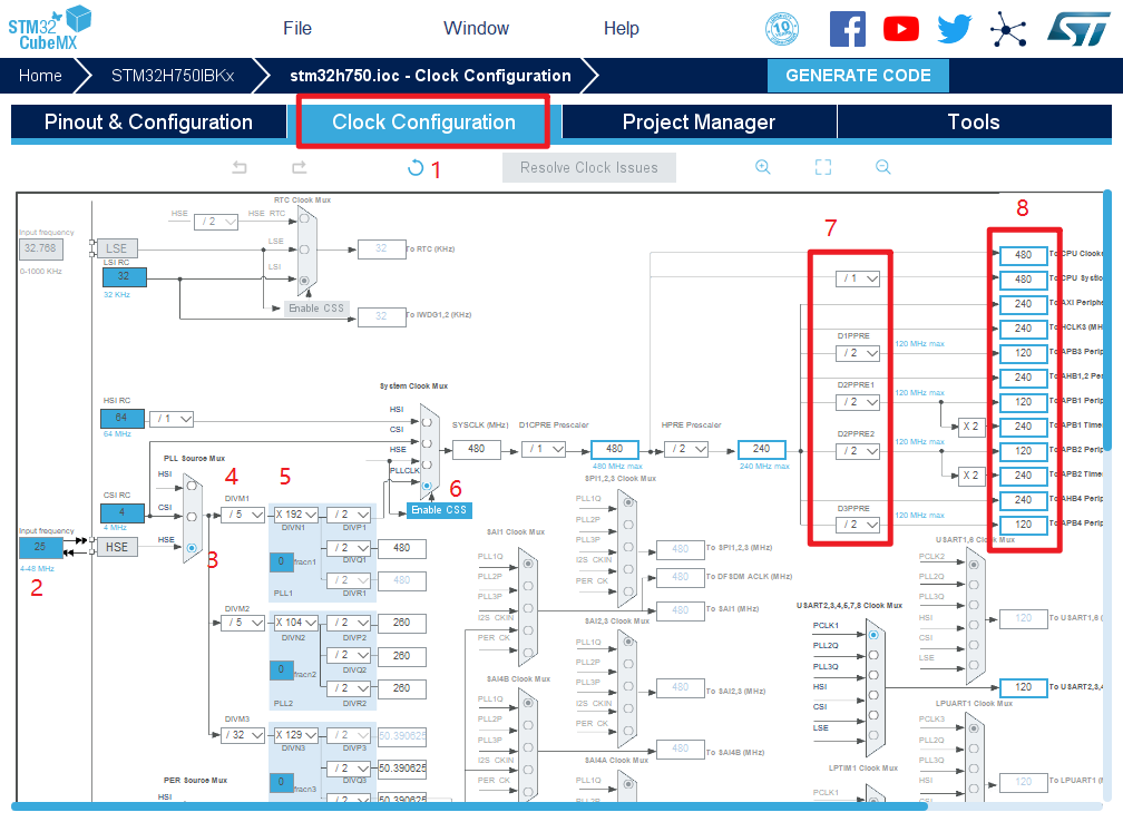 14.时钟源设置,选择外部高速时钟源,配置为最大主频