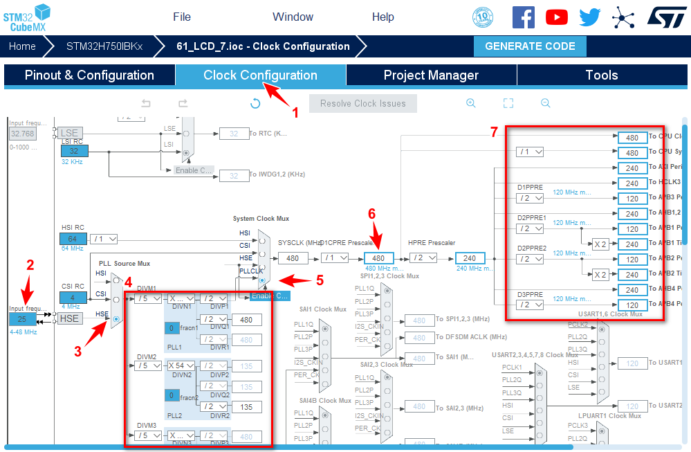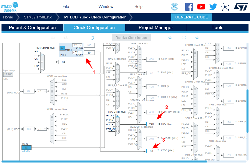 1.在主界面选择File–>New Project 或者直接点击ACCEE TO MCU SELECTOR 2.出现芯片型号选择,搜索自己芯片的型号,双击型号,或者点击Start Project进入配置 在搜索栏的下面,提供的各 种查找方式,可以选择芯片内核,型号,等等,可以帮助你查找芯片。本实验选取的芯片型号为:STM32H750IBKx。 3.配置RCC,使用外部时钟源 4.时基源选择SysTick 5.配置GPIO和引脚模式,引脚为PA10,PB4,PB7,PB8,PF6。 6.配置LTDC,引脚为PA8,PC7,PD3,PF10,PG6,PG7,PG10,PG12,PH9,PH10,PH11,PH12,PH13,PH15,PI0,PI5,PI6,PI7,PI9,PI10。 7.配置TIM12。 8.配置FMC,引脚为PD0,PD1,PD8,PD9,PD10,PD14,PD15,PE0,PE1,PE7,PE8,PE9,PE10,PE11,PE12,PE13,PE14,PE15,PF0,PF1,PF2,PF3,PF4,PF5,PF11,PF12,PF13,PF14,PF15,PG0,PG1,PG2,PG4,PG5,PG8,PG15,PH2,PH3,PH5。 9.时钟源设置,选择外部高速时钟源,配置为最大主频。 10.工程文件的设置, 这里就是工程的各种配置 我们只用到有限几个,其他的默认即可 IDE我们使用的是 MDK V5.27 11.点击Code Generator,进行进一步配置