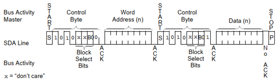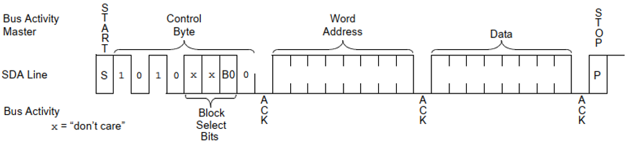 • 如图19-1,SCL一般由主机驱动发向从机。下面对开始标志(START)后的第一个字节进行解析:该字节主要包含器件专用地址码(高7位)和数据方向标志位(低1位),其中,专用地址码的高4位为器件类型,由厂家制定,低3位位器件引脚定义,由使用者定义。数据方向标志位,‘0’表示数据方向由主向从,‘1’表示数据方向由从向主。