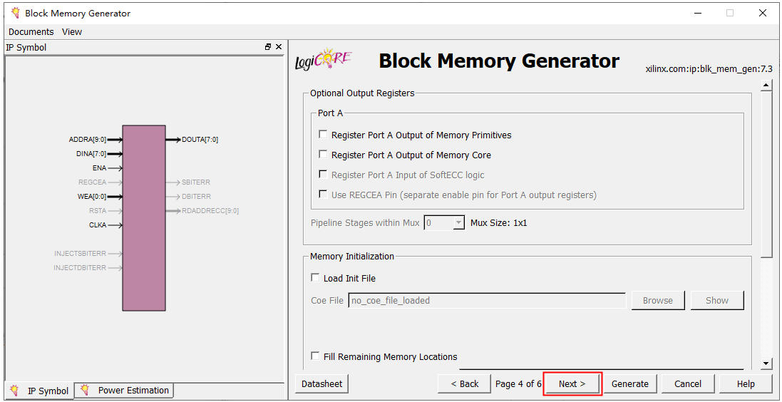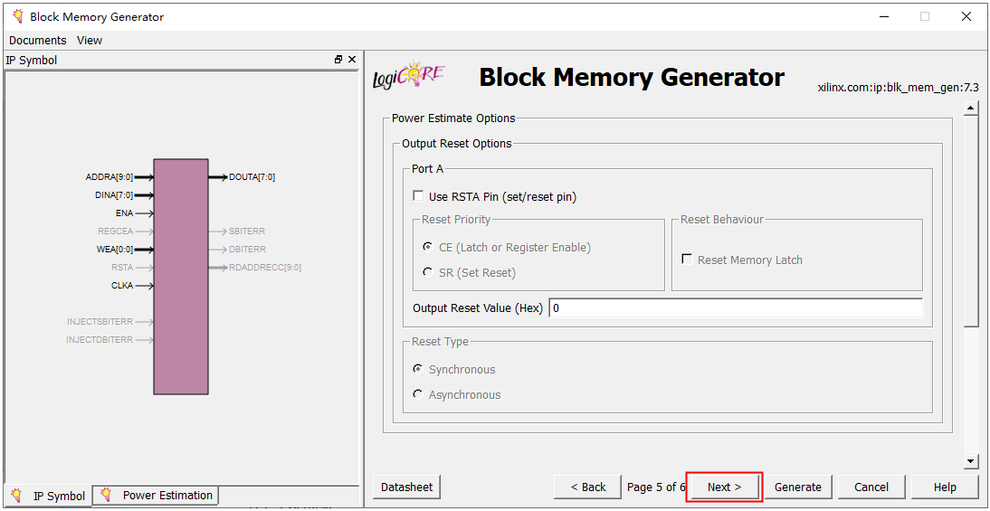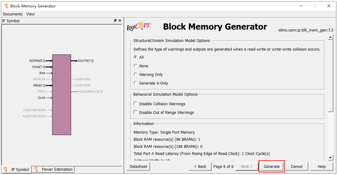 10、点击Generate,完成单口RAM IP核的添加。