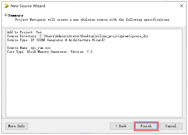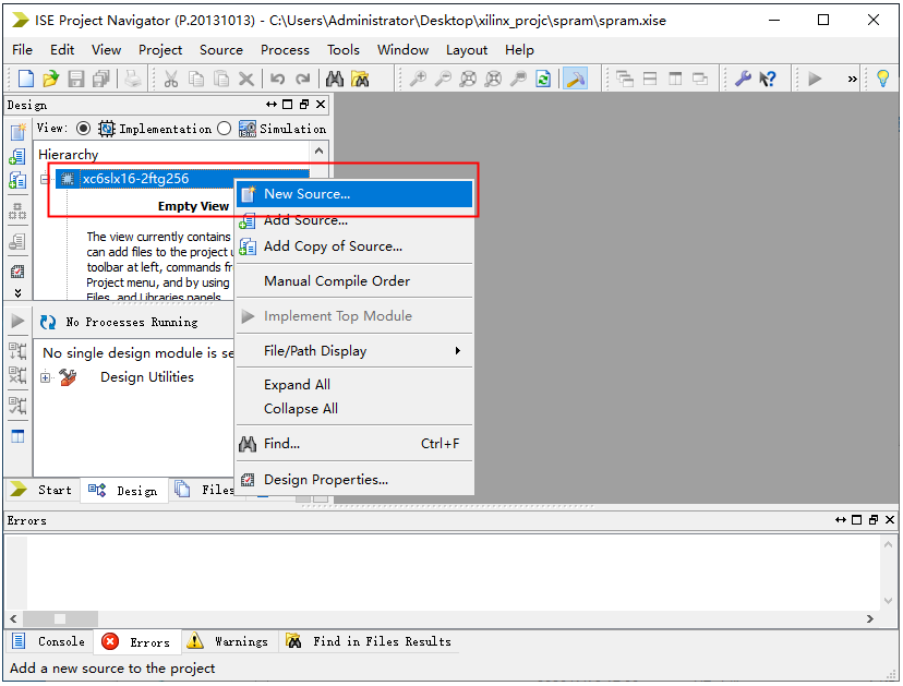 1、新建一个工程名为spram的工程,然后在工程目录选中工程,右键单击,下来菜单中点击New Source …。