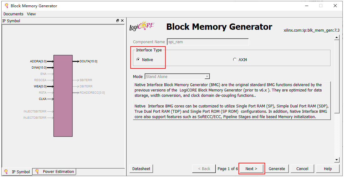 5、然后弹出RAM IP 核相关信息设置的界面,这里的Interface Type选项保持默认设置Native即可,然后点击Next,如下图所示: