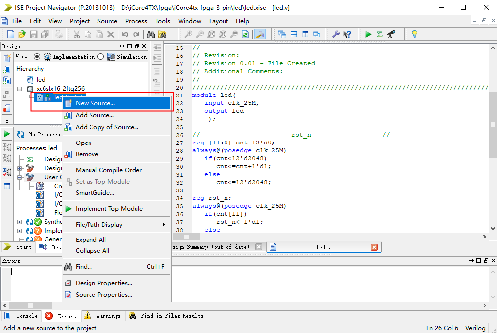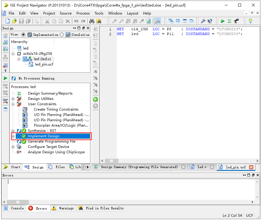 分别按照手动分配引脚方式和.ucf文件分配引脚方式分配引脚并编译整个工程。